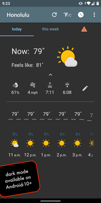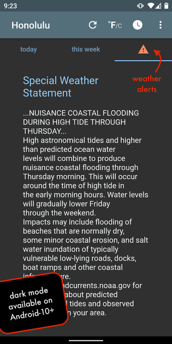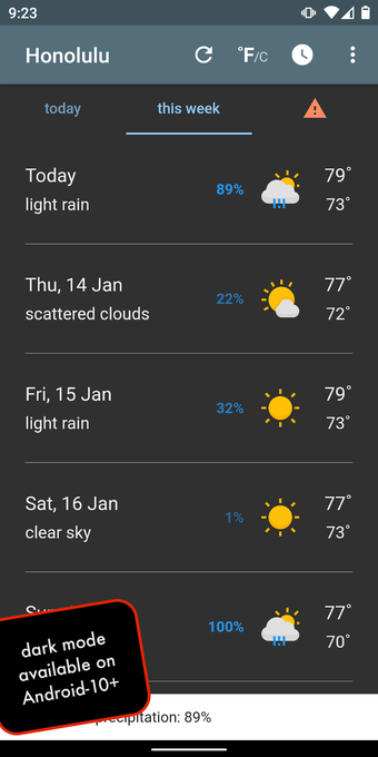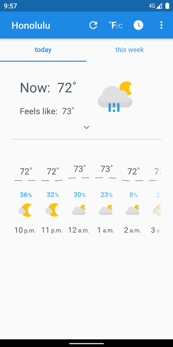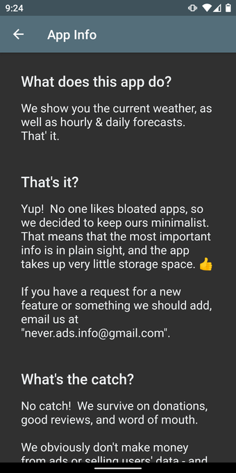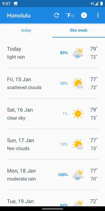 يحتوي التطبيق على واجهة بسيطة ولا يستغرق مساحة كبيرة على جهازك. إنه مثالي لأولئك الذين لا يرغبون في التعامل مع الزخارف الرسومية الزائدة أو الإعلانات غير الضرورية. يستخدم Just Weather بيانات الطقس من OpenWeatherMaps.org لتوفير معلومات دقيقة وموثوقة حول الطقس في موقعك وفي مواقع أخرى حول العالم. التطبيق سهل التصفح ويوفر توقعات ساعية ويومية وأسبوعية. بشكل عام ، Just Weather هو تطبيق رائع لأولئك الذين يرغبون في تطبيق طقس بسيط وفعال.